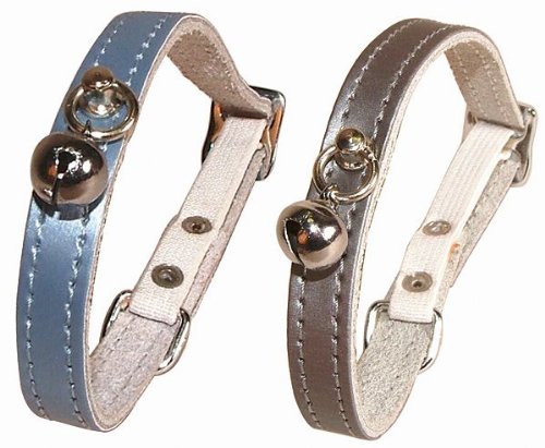 Collier pour chat, en cuir irisé, agrémenté d'un grelot et du "safety system" anti-étranglement. Existe en 3 couleurs (bleu, rose, gris). Composition: cuir.