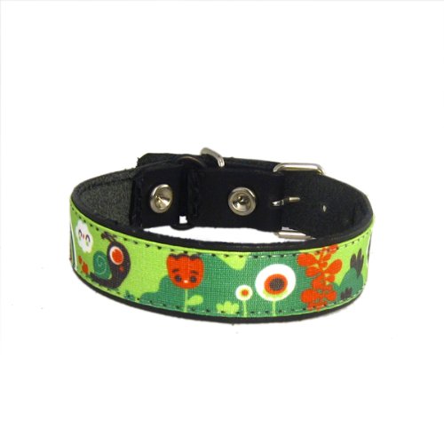 Collier en cuir pour chat Fauniflore vert avec système de fermeture par boucle passant en métal. D'une largeur de 1,7 cm, ce collier convient aux chats ayant un tour de cou allant de 18 à 22 cm. Illustration de l'artiste Lulu. Fabriqué en France