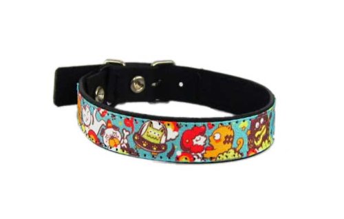 Collier en cuir pour chat Happy World Bleu avec système de fermeture par boucle passant en métal. D'une largeur de 1,7 cm, ce collier convient aux chats ayant un tour de cou allant de 23 à 27 cm. Illustration de l'artiste Gunawan Lo. Fabriqué en France