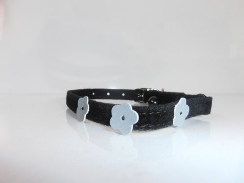 Collier pour chat noir avec grelot et petites fleurs grises.
