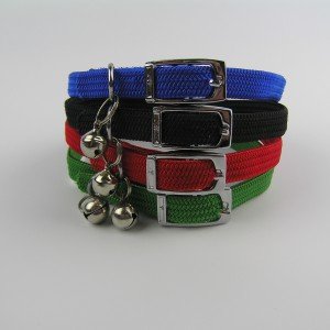Collier pour chat. Ce collier pour chat est entièrement élastique pour une extrême sécurité, très importante lorsque votre chat sort dehors afin qu'il ne reste pas accroché à une branche, un grillage etc D'une longueur de 30 cm (réglage au maximum à 28 cm environ) et d'une largeur de 1 cm, ce collier s'ajuste parfaitement à la taille de votre chat grâce à une boucle chromée, il possède aussi un grelot, très pratique pour repérer votre chat et suivre ses entrées et sorties de la maison. Laisse ou harnais pour chat : consulter notre rubrique : laisse ou harnais chat.